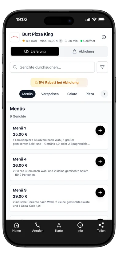 1 Partypizza 60x40cm nach Wahl, 1 großer gemischter Salat und 1 Getränk 1,0l oder 2 Spaghettieis - für 5 Personen